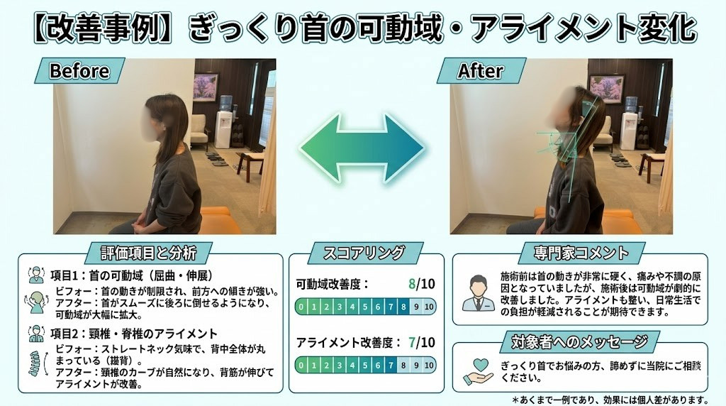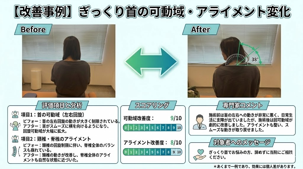 施術前は「向こうを向く」ことすらままならなかった首が、1回の施術で劇的に可動域を回復されました。