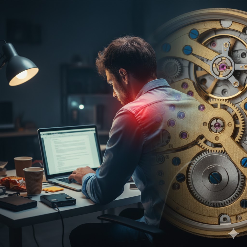 無理な姿勢での長時間作業により、骨格と筋肉の連携が崩れ、エラー(痛みや重だるさ)が慢性化している。このまま使い続ければ、いつかシステムダウン(強制終了)してしまいます。