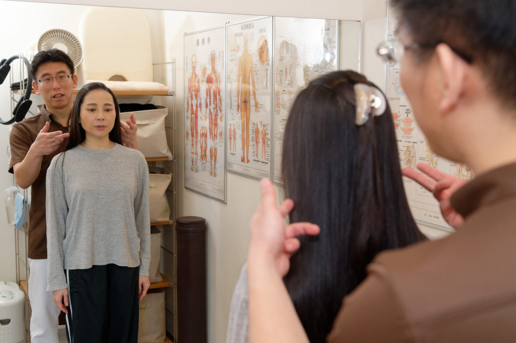 2. 鏡を使った検査で、自分でも気づかなかった体の傾きを自覚していただきます。専門知識よりもご本人に体の歪みを自覚していただくことを大切にしています。